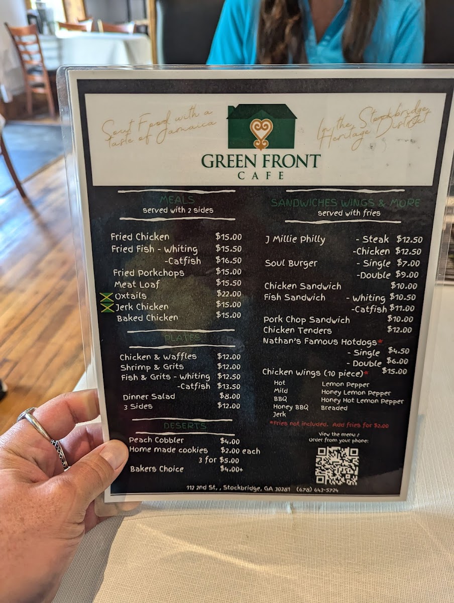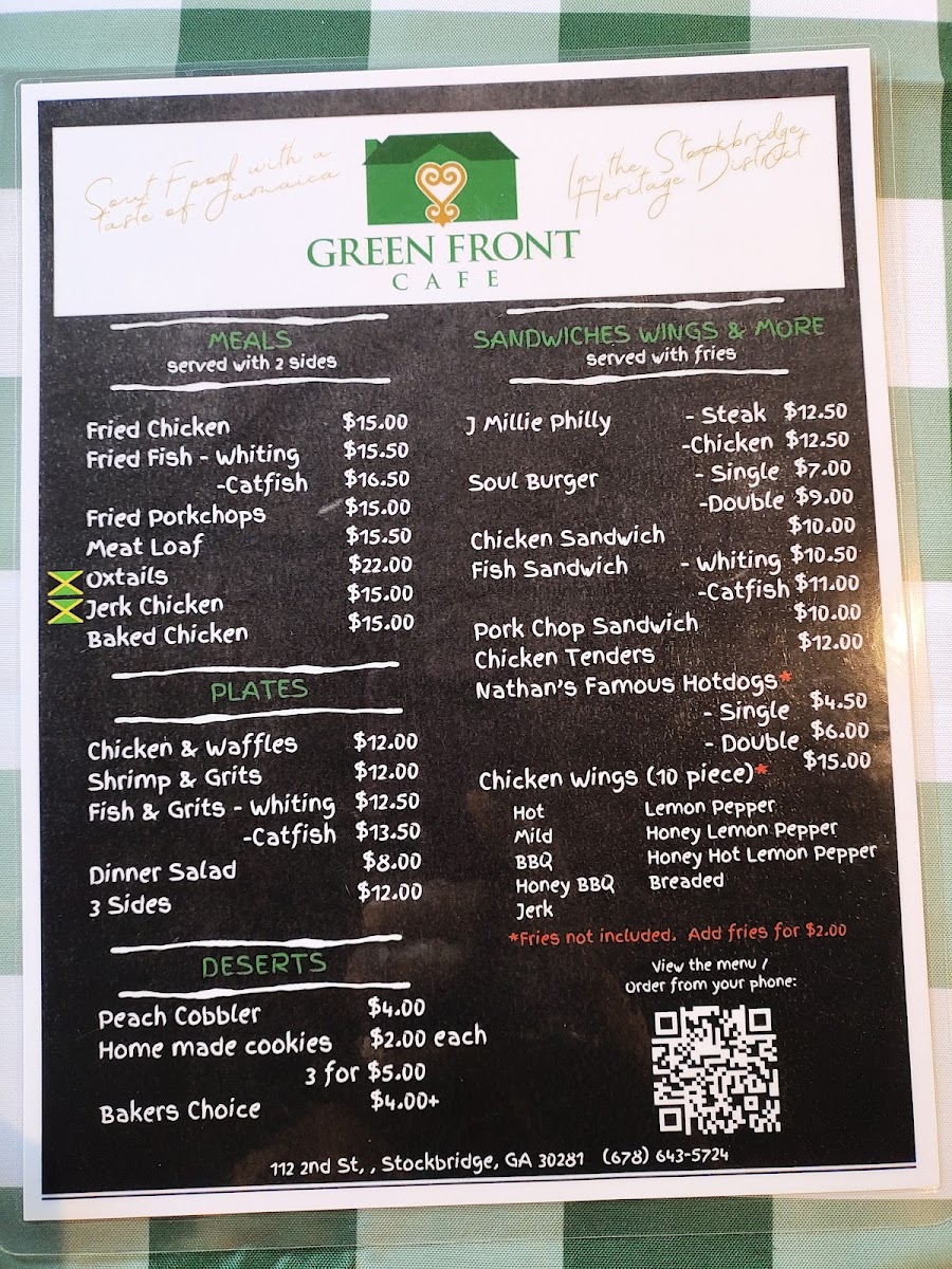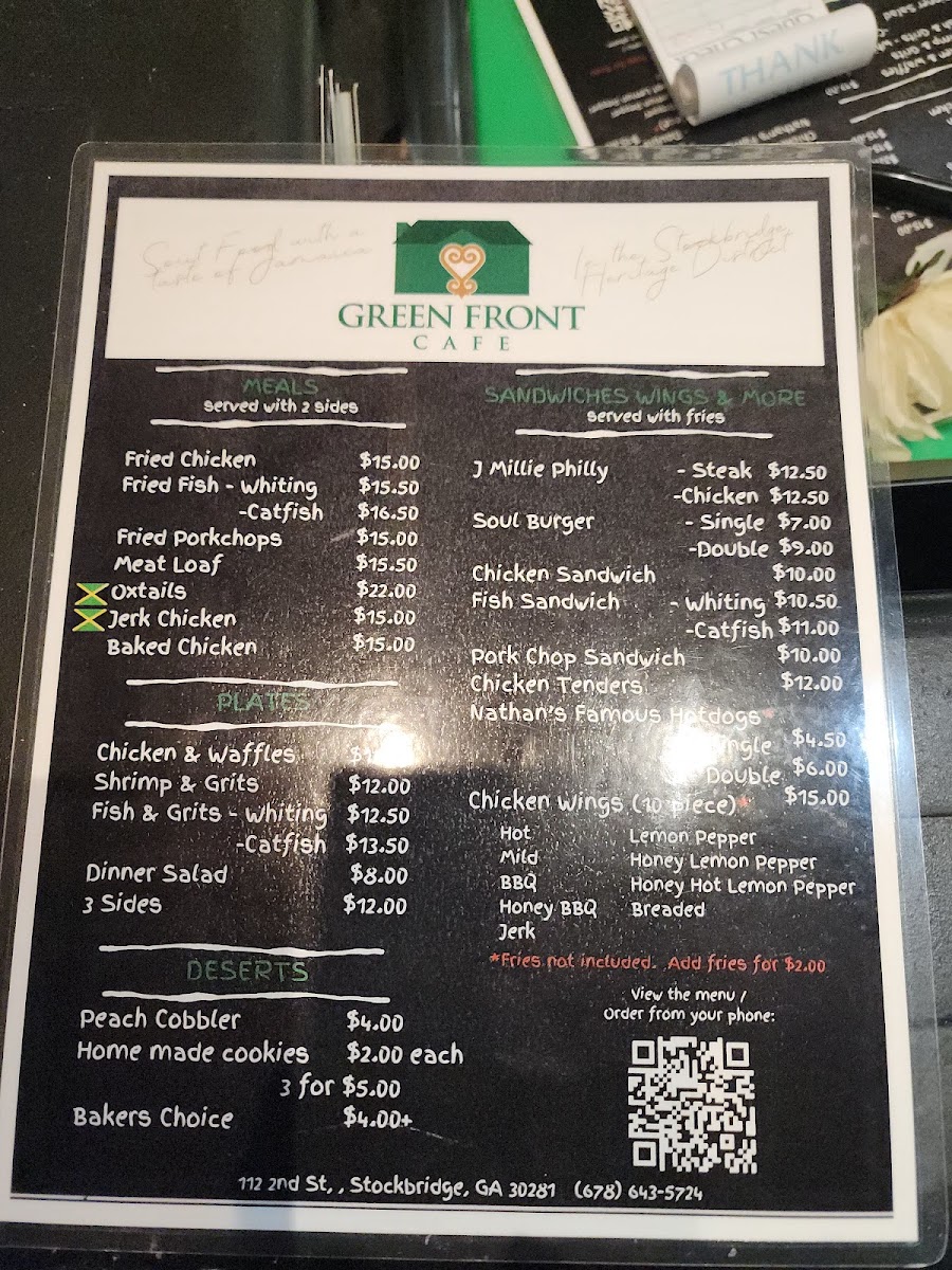 Welcome to Green Front Cafe, a hidden gem in Stockbridge, GA, that captivates food lovers with its rich menu of Jamaican delights and soulful comfort food. Located at 112 2nd St, this inviting cafe combines warm hospitality with vibrant flavors. Must-try dishes include the Escovich Snapper—a flavorful seafood option that reflects the essence of Jamaican cuisine—alongside classic favorites like fried catfish and jerk chicken, both expertly seasoned and cooked to perfection.